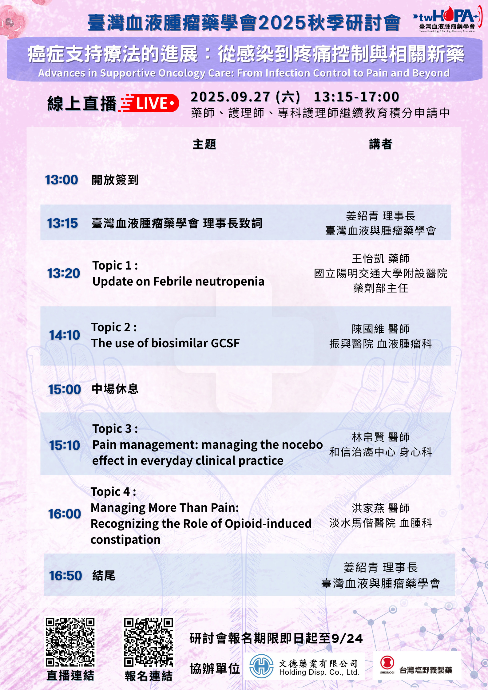 選單 研討會快訊 最新醫療快訊 藥物安全警訊 學會行事曆 2025秋季研討會 開放報名 時 間:114年9月27日(六) 13:15~17:00 (視訊) 地 點: 臺灣血液腫瘤藥學會YouTube頻道線上 主辦單位:臺灣血液腫瘤藥學會 協辦單位:文德藥業有限公司、台灣塩野義製藥股份有限公司 注意事項: 1.本研討會採用GOOGLE簽到,須完成簽到、課後滿意度及簽退,方能獲得學分。 2.報名開始日:即日起至9月24日 3.若有相關課程問題,請洽研討會聯絡人任冠臻小姐。E-mail: twhopa@gmail.com ---請使用海報連結掃碼填單報名--- 2025-09-01 查看更多 臺灣免疫腫瘤學會攜手臺灣血液腫瘤藥學會 擴大推動癌症免疫治療教育訓練 為促進癌症免疫治療領域之跨專業合作與藥師專業參與,臺灣免疫腫瘤學會於第三屆第二次理監事會議(114年4月12日)中正式決議,擴大邀請臺灣血液腫瘤藥學會共同籌辦本年度冬季學術研討會。 本次合作旨在強化癌症免疫治療相關教育訓練,深化藥師對免疫治療藥物之認識與實務應用能力,提升整體照護品質。藉由整合醫師與藥師之專業,共同守護癌症病患的用藥安全,實現以病人為中心的全人照護目標。 學會期待透過此次協同舉辦研討會,不僅擴大藥師的參與,更促進醫療團隊之間的知識交流與臨床合作,共同迎向精準醫療與免疫治療的新時代。 2025-07-29 查看更多 2025夏季研討會 開放報名 時 間:114年7月26日(六) 13:15~17:00 (視訊) 地 點: 臺灣血液腫瘤藥學會YouTube頻道線上 主辦單位:臺灣血液腫瘤藥學會 協辦單位:中化裕民健康事業股份有限公司、嬌生股份有限公司 注意事項: 1.本研討會採用GOOGLE簽到,須完成簽到、課後滿意度及簽退,方能獲得學分。 2.報名開始日:即日起至7月26日 3.若有相關課程問題,請洽研討會聯絡人任冠臻小姐。E-mail: twhopa@gmail.com ---請使用海報連結掃碼填單報名--- 2025-07-26 查看更多 Explore Innovations in Bispecific Antibody Therapy - Live Expert Panel Kfsyscc Koo, Join us for this MedscapeLIVE! Event 2025-06-03 查看更多 Immunotherapy for Gastroesophageal Cancers 2025-06-02 查看更多 Optimizing Prostate Cancer Management: Leveraging PSMA Imaging to Enhance Treatment Strategies Featured Video 2025-05-27 查看更多 Get Ready for the UTIC Course with This Recommended Precourse Playlist 2025-05-24 查看更多 Join ISOPP’s upcoming webinar: Compassion Fatigue in Oncology Pharmacists Webinar Series in June 2025 2025-05-21 查看更多 123