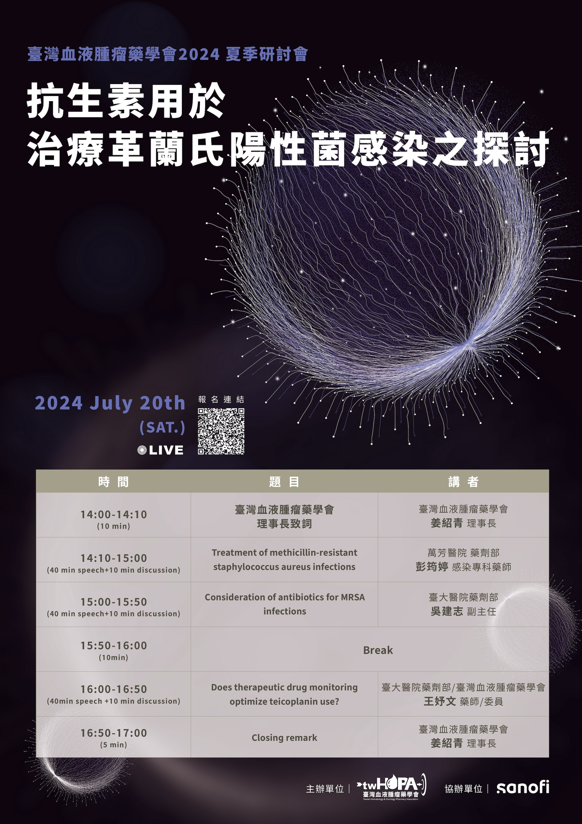 選單 研討會快訊 最新醫療快訊 藥物安全警訊 學會行事曆 TSITC 2024 Winter Meeting- Best of TSITC(冬季學術大會) 活動時間 :2024年11月30日(星期六)上午10:35~12月1日(星期日)下午13:35 活動地點 :張榮發國際會議中心8樓801會議室(台北市中正區中山南路11號) 請至 台灣免疫暨腫瘤學會 網站詳閱報名 2024-10-22 查看更多 「危險藥品調配自動化」研討會開放報名 2024-10-18 查看更多 Live Webinar on Pediatric Diffuse High-Grade Gliomas in Two Weeks! Presented By: Following this activity, participants should be able to: Fees: There is no fee to attend this webinar. Accreditation: This educational program is approved for continuing education credit for pharmacists, physicians, nurses, PAs, and other oncology professionals. Upcoming Pharmacy Updates Webinar: 2024-08-16 查看更多 Save the Date! Redefining Care for Hormone Receptor-Positive Metastatic Breast Cancer at ESMO 2024 2024-08-13 查看更多 TSITC 2024夏季醫藥創新暨雙重免疫治療論壇(報名截止7/31) 活動主題 : TSITC 2024 Summer Meeting - Dual I-O Summer Forum活動時間 : 2024年8月24日(六) 上午11:00~下午16:45 活動地點 : 張榮發國際會議中心10樓1002會議室(台北市中正區中山南路11號) 線上入口 : 尚未開放 活動類型 : 實體、線上活動 報名期間 : 即日起至7/31截止 主講人 : 吳教恩、宋孟達、賴峻毅、陳三奇、謝燿宇、梁逸歆、張家崙、黃得瑞、王妤文、林泊宏等專家 主辦單位 : 台灣免疫暨腫瘤學會 協辦單位 : 臺灣血液腫瘤藥學會(TWHOPA) 報名費用 :【實體】$500元;【線上】$300元,本會及TWHOPA會員[免費],詳見下方說明。 教育積分 : (申請中)中華民國癌症醫學會、台灣內科醫學會、西醫師/(專科)護理師、藥師執業執照積分、台灣腫瘤護理學會、公務人員學習時數3小時。 其他說明 : 收費方式 (實體/線上,僅能擇一參加)A. 本會會員:實體/線上皆[免費]。 提供:☑電子手冊 ☑學分 ☑小贈品 ☑精緻午餐 ☑咖啡點心 ☑觀看回放影片 ☑會後授權講義下載 ☑專屬Webex連結及ID(線上場限定)B. 臺灣血液腫瘤藥學會(TWHOPA):實體/線上皆[免費]。 TWHOPA會員,請統一點選[非會員報名]進入報名,於[繳費帳號後五碼]欄位輸入折扣碼,折扣碼請洽TWHOPA秘書處取得(任冠臻小姐 E-mail: twhopa@gmail.com)。 提供:☑電子手冊 ☑學分 ☑小贈品 ☑精緻午餐 ☑咖啡點心 ☑專屬Webex連結及ID(線上場限定)C. 非以上兩學會會員 [收取報名費]【實體場】$500元 。 提供:☑電子手冊 ☑學分 ☑小贈品 ☑精緻午餐 ☑咖啡點心 ☑觀看回放影片 ☑收據【線上場】$300元 。(須另在Webex註冊頁面登記學分需求及簽到退--尚未開放) 提供:☑電子手冊 ☑學分 ☑觀看回放影片 ☑專屬Webex連結及ID ☑收據※Webex連結於會前1週email提供 ※線上聽講,不接受任何文字或音訊提問 ---------------------------------------------報名費匯款資訊:|戶名:台灣免疫暨腫瘤學會 |學會帳號:3638-871-000129 |銀行:006 合作金庫銀行(長庚分行)---------------------------------------------注意事項: 1. 跨行轉帳費由匯款人自行吸收。 2. 匯款成功後7個工作日對帳,將以Email提供電子收據,恕不退費,請見諒。 3. 報名時,請於報名頁面填入匯款帳戶後五碼,以利查帳。 4. 報名時,請務必填入真實中文姓名及正確Email, 以利收據發送。 5. 收據預設報名者姓名,如改開公司行號抬頭/打統編,請於報名頁面下方[其他]欄位中,清楚註明。贊助單位: 2024-07-15 查看更多 2024 夏季研討會 開放報名 臺灣血液腫瘤藥學會2024夏季研討會於2024年7月20日舉辦 時 間:112年7月20日(六) 14:00~17:10 (視訊) 地 點:臺灣血液腫瘤藥學會YouTube頻道線上 主辦單位:臺灣血液腫瘤藥學會 協辦單位:賽諾菲股份有限公司 學 分:藥師繼續教育學分、護理師/專科護理師繼續教育學分申請中 注意事項: 1.本研討會採用GOOGLE簽到,需完成事先報名、簽到、課後滿意度及簽退,方能獲得學分。 2.報名開始日:112年6月25日起至7月18日 3.若有相關課程問題,請洽研討會聯絡人任冠臻小姐。E-mail: twhopa@gmail.com ---請使用海報連結掃碼填單報名--- 2024-07-03 查看更多 June Live Webinars and On-Demand Activities 2024-06-06 查看更多 Register for "Relapsed/Refractory Diffuse Large B-Cell Lymphoma" 2024-05-23 查看更多 12345